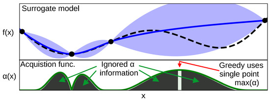 Selection strategies such as the acquisition functions presented in Section 2.1.1 are spatially greedy as they only select the point that maximizes the acquisition function and ignores all information provided by the acquisition function across the optimization domain . This can be seen in Figure 4. Moreover, despite acquisition functions being designed to trade off exploration and exploitation to efficiently carry, they rely on the assumption that the surrogate model is good enough to predict both the expected function value and its uncertainty accurately. Since, in practice, surrogate model parameters are learned as the BO progresses, model inaccuracies are common, especially at the beginning of the BO, which might impact the theoretical optimality of some acquisition functions.