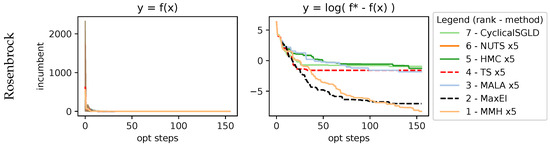 The most underperforming methods, NUTS and HMC, suffer from one of the challenges of acquisition sampling, that is, the variability in the function that we sample as the BO progresses and its relationship to the MCMC parameters. In particular, if the mass matrix M is a poor approximation of the target distribution covariance, it will be required to compensate for other parameters to perform a more fine-grained integration (i.e., smaller step size and a higher number of integration steps) to maintain numerical precision. Even when actively tuning these parameters, it is still challenging [44]. In our setup, failing to choose good parameters across all Bayesian optimization steps leads to poor performance. Out of the best-performing methods, CyclicalSGLD and the MALA share that they use the gradient information, helping to improve MCMC efficiency, and the parameters are not as critical for chain convergence or hard to choose. Finally, the most interesting result is the MMH. Metropolis–Hastings is a classic algorithm that is also quite simple compared to other methods since it only has a single parameter: the proposal distribution. In our experiments, we opted for a mixture of distributions as a proposal, with a uniform distribution allowing global jumps to change between multiple modes of the acquisition function and multiple Gaussian processes that enable traversing the locality of the probability. Experiments show that, even on higher dimensions, this mixture approach is performant.