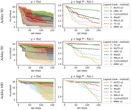 with recommended variables , , and and evaluated within the domain , and we evaluated it for the 3D, 5D, and 10D cases. Results in Figure 8 show that as dimensions increase, the performance of MaxEI and TS deteriorates compared to AS. Within the AS methods, MMH, CyclicalSGLD, and MALA methods show better performance.