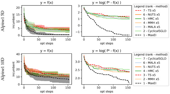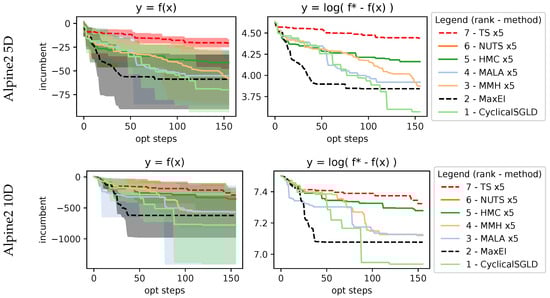 with the search space being and respectively. Alpine1 evaluation at 5D and 10D in Figure 9 shows how MaxEI performs better. For AS methods, only CyclicalSGLD matches the performance of MaxEI. MMH is the second, followed by the MALA. However, it seems that methods are stuck in suboptimal regions. This can be seen in Alpine2, evaluated at 5D and 10D, shown in Figure 10, which has a smaller search space and is able to reach better incumbent values. In this case, the best-performing method is CyclicalSGLD, followed by the MALA and MMH.