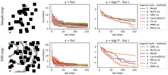 In this section, we cover the problem of finding the lowest-cost trajectory of a rover in a surface map between an initial point and an endpoint, where the cost represents possible terrain irregularities or obstacles that we wish to avoid. This setting is based on optimizing rover trajectories from Wang et al. [43], and we follow the changes introduced in [14]. We define a parametrized trajectory with a B-spline that starts fixed at the starting position, ends fixed at the goal position, and, as parameters, uses two control points that will define the curvature of the B-spline. The overall dimensionality of the problem we are solving is 4D since we have to optimize the two control points that are 2D. Trajectory cost is integrated along the trajectory at a fixed interval using 1000 steps. We use two different maps, as shown in the picture inside Figure 11, with both maps sharing the same start and goal but differing on the costs (e.g., different obstacles). Results are also shown in Figure 11, where it shows that MaxEI has some trouble finding the optimal zero-cost trajectory. Meanwhile, AS and TS are capable of finding such a trajectory. In particular, MMH and the MALA are the AS methods that are capable of solving the problem.
