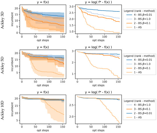 Results on 3D, 5D, and 10D Ackley function using MMH comparing AS against BS with different temperatures. These plots showcase the difficulty of tuning the temperature parameter for BS. It shows how AS performs better without a parameter.