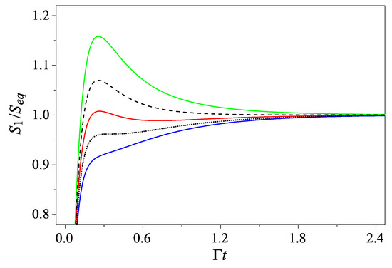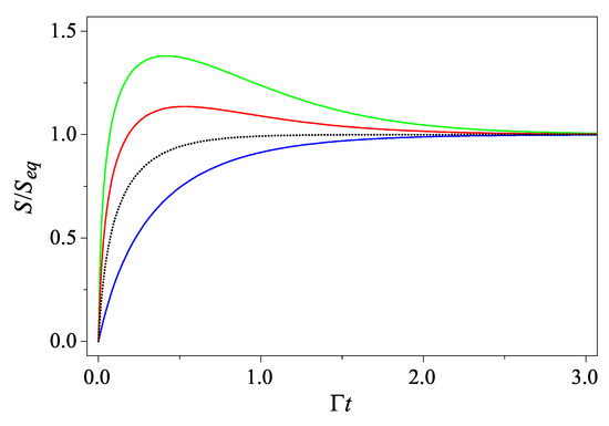 suggesting that the entropy increases monotonically from to its equilibrium value , as expected. However, for an initial squeezed state with , the evolution of entropy becomes more complicated. There exists a certain time