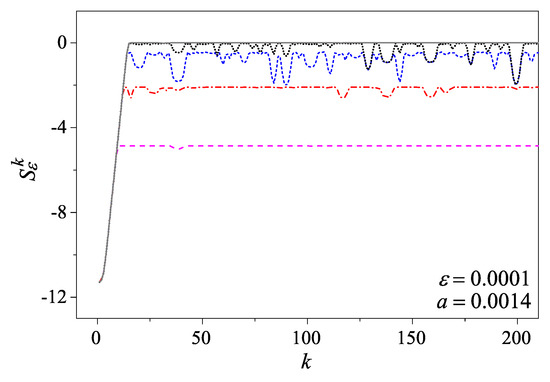 Making use of Equation (10) and letting , the entropy of the system (with initial state ) can be written explicitly as