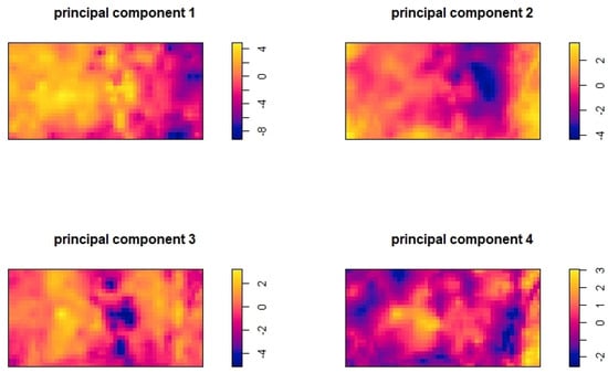 where are the first four principal components, and the same number of features has been used in a previous study [] for feature selection in the IPPP. The distributions of these four principal components are shown in Figure 1. As the principal components have a descending order of contributions to the variance of the data, to balance the contribution of each principal component to the intensity function, each principal component was weighted by the inverse of its standard deviation, i.e., and , respectively. The simulated Poisson point patterns were then generated using this intensity function. Figure 2 shows one of these generated Poisson point patterns.