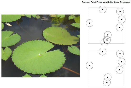 We mentioned the IPPP in Section 4 and used it to generate simulated point patterns in Section 5. The IPPP assumes that the individuals are independently distributed from each other in the survey area. However, for some species, this is not true, and we would not use the IPPP to describe their distributions. The hardcore process is one of the point processes that models the interactions between points. It is a special case of the Neyman–Scott process []. The hardcore process is a two-step model. In the first step, a parent process (usually the IPPP) generates points in the study area. Then, following the rule that for each point, no other points exist within a certain distance, points that have their exclusive zones overlapped with other zones are removed until no zones overlap. The hardcore process creates a repulsive effect, resulting in a spatial pattern where points tend to be more regularly spaced []. This repulsive effect might be caused by several behaviors, including resource competition and territoriality. An example would be lotus leaves. The distributions of lotus leaves are hardcore-like (not exactly a hardcore process, since the radius of a leaf is not fixed). Since a lotus leaf will cover all the seeds under it within its shadow, these seeds will not gain enough sunlight. This is a very classic resource competition case. The hardcore process is shown in Figure 5. When two points violate the exclusion zones of each other, one of them is randomly selected and removed (other removing rules might apply depending on the context, and here we use the simplest one by totally randomly selecting one to remove).