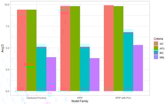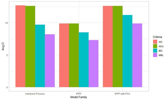 In all 50 trials, MML showed superior performance in feature selection with an average Hamming distance equal to 0. This means that MML correctly selected the feature used to generate the point patterns, even when the model was misspecified. This result matches the previous study [,], where MML also showed a surprisingly strong robustness against model misspecification compared to other criteria. The prediction performances of the models selected by the different criteria (AIC, AICc, BIC, MML) did not have significant differences from one another.