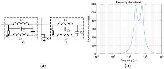 The two ends of the ultra-high-transmission line are fitted with a trap, which has the effect of preventing high-frequency signals from passing through, while medium- and low-frequency signals, such as industrial-frequency signals, propagate almost unaffected. The trap shown in Figure 1a is an XZF-3150-1.0/63-B1-type band-tuned trap with the following specific parameters: L1 = 1 mH, C1 = 3466 pF, R = 800 Ω, C2 = 1563 pF, L2 = 2.22 mH, and ZT = sL1//(1/sC1) // (R + sL2 + 1/sC2). The impedance frequency characteristics of this model are shown in Figure 1b. The trap exhibits high impedance for transient signals located in the high-frequency band of [42, 580] kHz, with impedance values greater than 800 Ω, while it exhibits low impedance for signals of medium and low frequencies. The transient signals in the resistance band are significantly attenuated by the trap, which forms the line border of the erroneous high-frequency signals [17].