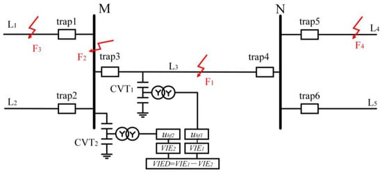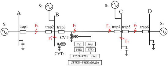 In the transmission system depicted in Figure 2, traps are provided at both ends of all the lines. After passing through the traps, the defective high-frequency signal experiences significant attenuation. Let the voltage detected by the line voltage transformer CVT1 be u1, and the voltage detected by the bus CVT2 be u2. The high-frequency elements of u1 and u2 are denoted as uhf1 and uhf2, respectively. In the following, we analyze the characteristics of the change in the high-frequency components of the transient voltages when malfunctions occur at the locations of F1, F2, F3, and F4, respectively. To enhance the stability of the technique, the information entropy of uhf1 and uhf2 is taken as the object of study. The information entropy of uhf1 and uhf2 are denoted as VIE1 and VIE2, respectively. The difference between the information entropy of uhf1 and that of uhf2 is defined as VIED, which is shown in Equation (7).