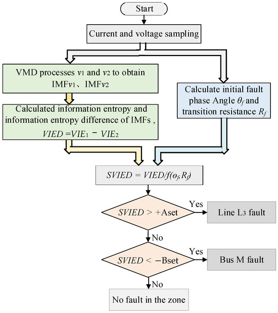 SVIED, which incorporates two fault condition attributes, becomes a four-dimensional dataset with multiple pieces of information. In the fault judgment process, the integrated fault characteristic examines the malfunctioning characteristic quantities analyzed from the viewpoint of the malfunction condition attribute, thus overcoming the influence of the fault condition attributes on the fault characteristic value. This significantly improves the accuracy of fault judgment and enhances protection reliability. The comprehensive fault characteristics include two fault condition attributes. In the fault judgment process, the suggested protection algorithm consists of the following six steps, and the algorithm flowchart is illustrated in Figure 4. The pseudocode for the proposed algorithm is presented in Pseudocode 1.