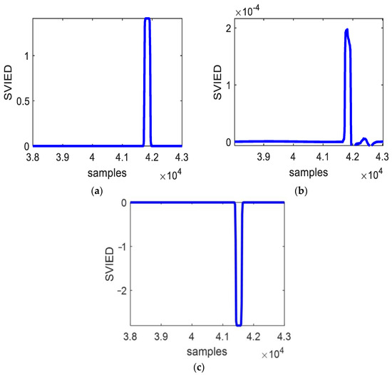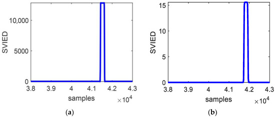 Figure 6 shows the SVIED change diagram for the fault characteristic when the malfunction beginning phase angle is 45° and the malfunction impedance is 5 Ω, corresponding to a short-circuit grounding malfunction in phase A at points F1 and F2 on transmission line BC. The diagram clearly demonstrates that, upon fault occurrence, the SVIED increases sharply, making the fault characteristics highly apparent.