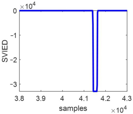 The SVIED for a malfunction impedance of 5 Ω when an A-phase ground short-circuit malfunction emerges at the busbar B with a malfunction beginning phase angle of fault of 45° is shown in Figure 7. After the fault occurs, the SVIED steeply and abruptly changes to a negative number, and its absolute value of SVIED becomes very large, making the fault characteristics clearly evident.