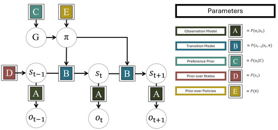 A discrete state-space POMDP in AIF is conventionally defined by five main sets of parameters: A, B, C, D and E [1,33], see Figure 1. Together, these parametrise the agent’s prior beliefs about the prior probability of different states in the environment, how states of the environment change and how they generate observations. Typically, they will be vectors, matrices or tensors; however, henceforth we denote them by their corresponding letter in bold. These make up the components needed for the agent to perform AIF.