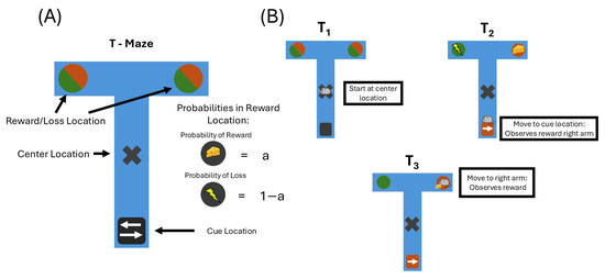 A T-maze is a simple task commonly employed in the behavioural sciences, as well as in the AIF literature [14,54,55,56,57]. It is a minimal type of task that requires balancing exploration and exploitation, or epistemic and pragmatic value, respectively. It is also suitably represents in a discrete state space. Together, this makes it easily compatible with a POMDP-based AIF approach.