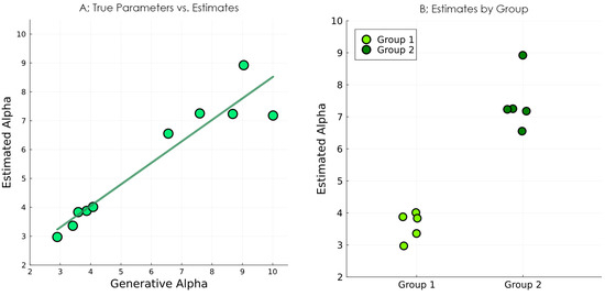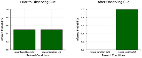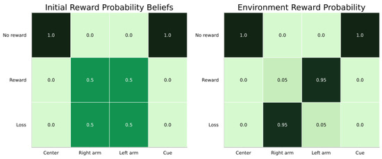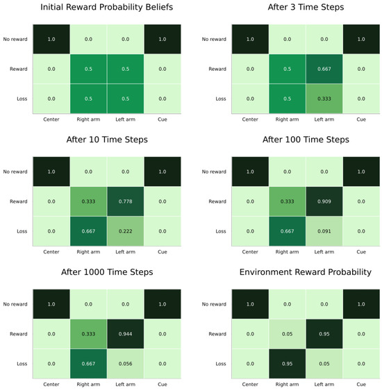 The updated value for the concentration parameter is found by adding the previous concentration parameter multiplied by a forgetting rate to the observed data count (either the observation in the case of A learning, or the inferred state or state transition for other matrices) multiplied by a learning rate . With this relatively simple update equation—which, in essence, amounts to just counting the occurrences of categories—an AIF agent can update its beliefs about the various matrices it uses to make inferences about environmental states. For more details on parameter learning with POMDPs, see [23,33,52].