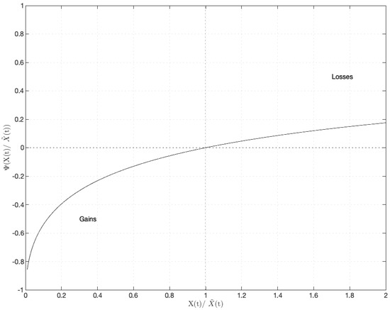 Figure 1 illustrates that the value function Ψ ( X ( t ) X ˜ ( t ) ) represents the deviation from a reference point where X ( t ) X ˜ ( t ) = 1 . Specifically, for X ( t ) > X ˜ ( t ) , the value function is positive, indicating risk-seeking behavior in response to losses. In contrast, for X ( t ) < X ˜ ( t ) , the function becomes negative and convex, reflecting risk aversion in the presence of gains.