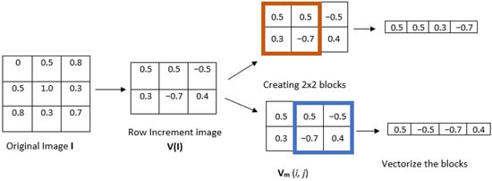 - Given a positive integer m, divide the increment image into overlapping blocks of size (see Figure 2, where ). We define Vm(i,j) as the m-length square block in image V(I), where the indices range from row i to and from column j to . The total number of blocks can be computed as for a row-wise increment image and for a column-wise increment image.