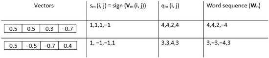 - Vectorize each block to obtain an increment vector Vm(i,j) and calculate the nth unique word sequence Wn for each Vm(i,j), for a given quantifying resolution R. Each element of the increment vector Vm(i,j) is mapped into word pattern composed of two parts: sign and magnitude . The sign function produces different results depending on the input element. If the input element is greater than 0, the function returns 1. If the input element is equal to 0, the function returns 0. If the input element is less than 0, the function returns −1. The magnitude that represents the extent of difference between these neighboring pixels is determined by the resolution parameter R. Subsequently, every increment vector is transformed into a pattern vector comprising elements (considering both sign and magnitude). To gain a complete understanding of creating a word pattern, let us consider the example of the template vectors illustrated in Figure 3, where the quantifying resolution R is taken as 4. The sign is calculated as = sign(Vm(i,j)), and magnitude is calculated using the following equation: