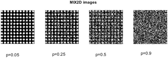 The creation of MIX2D(p) processes is based on the definition of its unidimensional version, MIX1D(p). MIX2D(p) denotes images where the parameter p corresponds to the level of white noise. As p goes from 0 (representing completely periodic sinusoidal images) to 1 (indicating highly irregular images), the images of size exhibit different degrees of spatial irregularity, described as , , where , and represents a uniform two-dimensional matrix of white noise, spanning from to . In this context, represents a random variable that takes the value 1 with a probability of p and the value 0 with a probability of [25]. Consequently, as the value of p increases, the images become more irregular; see Figure 4.