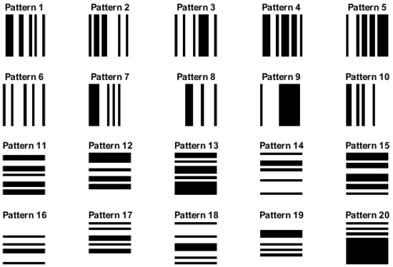 Simulated images of size 256 × 256 pixels with vertical stripes (patterns 1–10) and horizontal stripes (patterns 11–20).