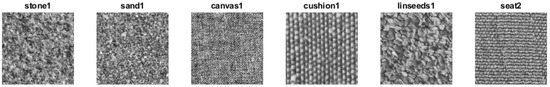 In this study, a portion of the Kylberg texture dataset was used. The dataset can be accessed publicly from [28]. Specifically, we chose six distinct categories of images. These images represent various fabrics and surfaces: canvas1, cushion1, linsseeds1, sand1, stone1, and seat2 (see Figure 6. Each sample is 576 × 576 pixels in size).