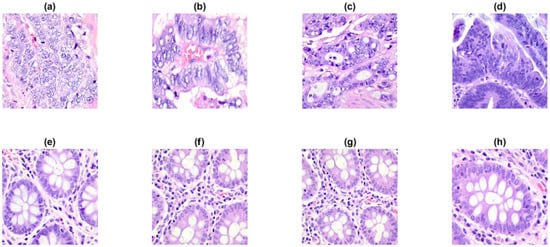 A few sample images (768 × 768 pixels) from the LC25000 dataset: (a–d) colon cancer tissues and (e–h) normal tissues.