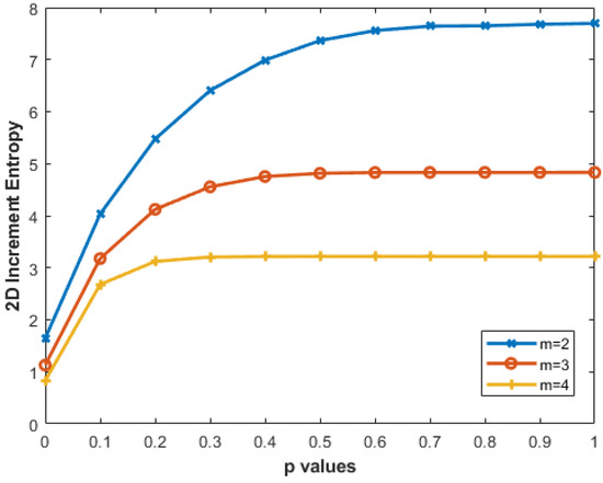 We created 256 × 256 pixel MIX2D(p) images by varying the parameters— and p = 0 to 1 with a step size of 0.05—resulting in 21 different p values. Figure 8 illustrates that higher p values correspond to greater IncrEn2D entropy. The entropy increase from to decreases with higher m: for , the range is 1.6435 to 7.6724, while for , it is 0.8280 to 3.2162. Smaller block sizes (e.g., ) capture finer details, while larger sizes encompass broader patterns.