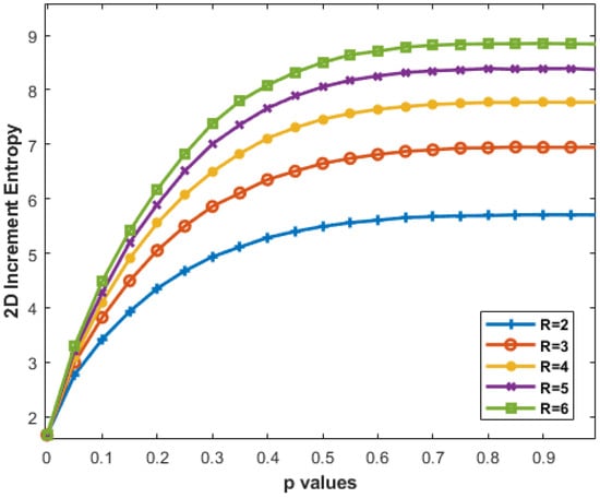 IncrEn2D for MIX2D(p) images of size 256 × 256 pixels for and varying R values from 2 to 6.