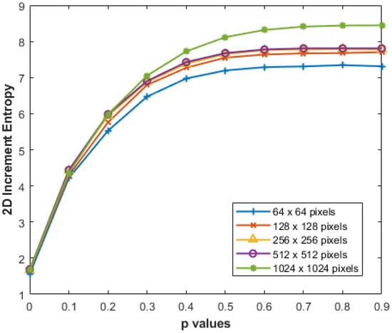 We conducted additional experiments to assess the reliability of our proposed IncrEn2D across varying image sizes, aiming to verify its performance in measuring image irregularity. Specifically, we computed IncrEn2D for MIX2D(p) while progressively increasing image sizes from to pixels, with , , and p varying from 0 to 1. The results, as depicted in Figure 10, consistently demonstrate stable results with changes in image size.