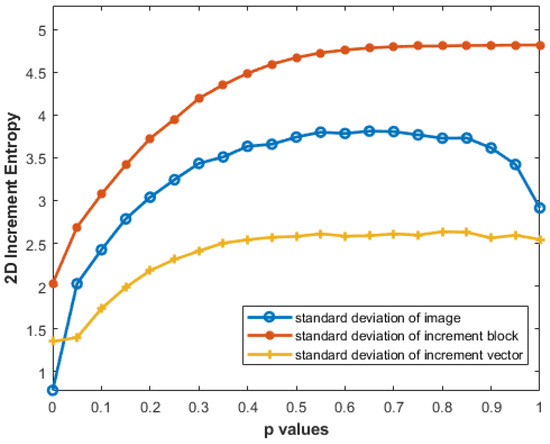 It is evident from Figure 11 that the results obtained with the standard deviation of the original image I are somewhat misleading: the entropy values for MIX2D(0.9) and MIX2D(1) are lower than those of MIX2D(0.8). The standard deviation of increment block (Vm(i,j)) provides better entropy estimates than the standard deviation of increment image (V(I)). The discrepancy arises from how the standard deviation is computed: the whole increment image considers all pixels, yielding a larger variance, while the increment block focuses on a fraction, providing a more localized measure of variation.