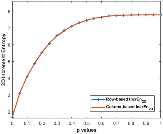 Our experiments with row-wise and column-wise increment images on MIX2D(p) show a similar curve (see Figure 12). MIX2D(p) images tend to exhibit certain statistical properties, such as local spatial correlation and smooth intensity transitions. These properties result in a relatively balanced distribution of pixel differences in both horizontal and vertical directions. While the row-wise and column-wise increment images may emphasize different aspects of the image structure, their overall impact on IncrEn2D entropy is comparable due to the statistical properties of MIX2D(p) images. The balance between horizontal and vertical variations ensures that the distribution of pixel differences is similar in both cases, leading to similar IncEn2D values.