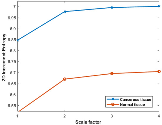 Multiscale IncrEn2D values with , , and scale factors from 1 to 4 for cancerous and normal tissues.