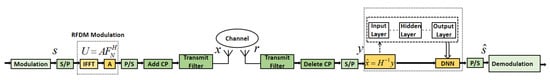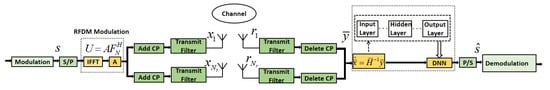 Since the matrix can compress the signal which will require fewer subcarriers or the number of antenna for transmitting the same data, and the original is not sparse, these lead to the challenge of RFDM: developing a low-complexity detector with acceptable accuracy. This detector consists of two parts: (1) Estimate according to the channel information as . (2) Reconstruct the original signal based on the DNN, as shown in Figure 1.