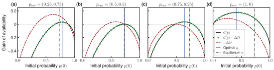 Availability gain as a function of the engine initial distribution . (a–d) correspond to four different environment initial distributions . Black lines show computed using Equation (17); green dots indicate predictions made using our information-theoretic expression (18) (using shorthand in legend). Optimal initial distribution q and equilibrium initial distribution are indicated using vertical lines. Dashed curve indicates reduction in the engine’s Shannon entropy as a function of initial distribution, from Equation (22). Vertical axes have the same scale. Other parameters: , .