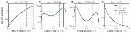 We now illustrate our results with some numerical experiments. In Figure 2, we show the gain of availability as a function of the engine’s initial distribution p, which is computed using Equation (17). Since the engine only has two microstates, p is fixed by probability of microstate , as shown on the horizontal axis. The different subplots correspond to the different initial distribution of the environment . The other parameters are set to and . We show the location of the optimal initial distribution q found by numerical optimization, and the value of is computed using using our information-theoretic expression (17). We also show the location of the initial equilibrium distribution .