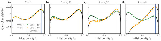 Gain of availability in a quantum system for different amounts of coherence (parameterized by ). Solid black line shows for states diagonal in the reference basis, dashed black line shows for states diagonal in the basis of the optimizer , both calculated using Equation (25). Markers indicate predicted values of from information-theoretic expression (26). (a) For (no coherence), we recover the classical result shown in Figure 3b. (b–d) Advantage of selecting initial state in the optimal basis increases with increased coherence. Vertical axes have the same scale. See text for details.