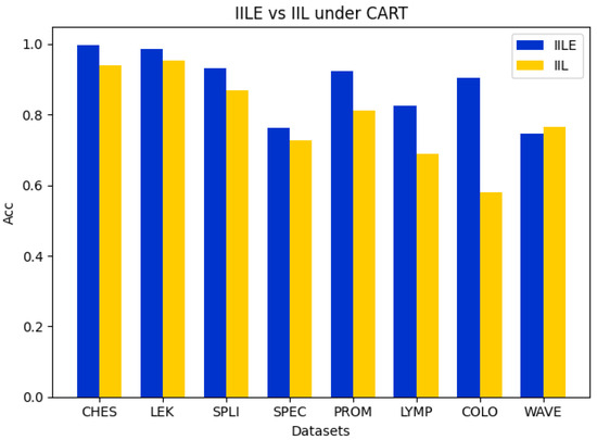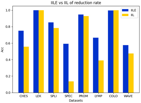 Table 6 presents the classification accuracies of HS, FSFC, GNRS, SRS, PME, MDS, and IILE on the CART. The results show that IILE can obtain the best results on most datasets except with LEK, SPEC, and WAVE. PME achieved the best results on the LEK and SPEC sets, while SRS achieved the best on WAVE. On LEK, SPEC, and WAVE, IILE is not optimal, but the difference between its performance and the best results is almost negligible. On the datasets PROM and LYMP, IILE can achieve the best classification accuracy, and the results increased by 4.9% and 4.72% compared with those of the sub-optimal algorithm, respectively. On average, the performance of MDS is similar to that of PME, and the difference between the two is within 1%. The above experiments intuitively show the classification accuracy of IILE.