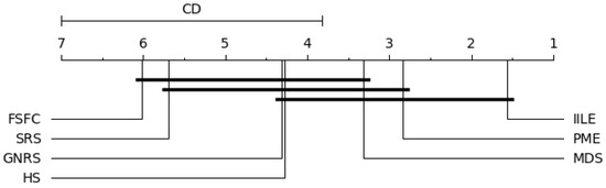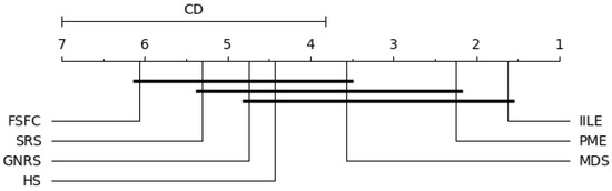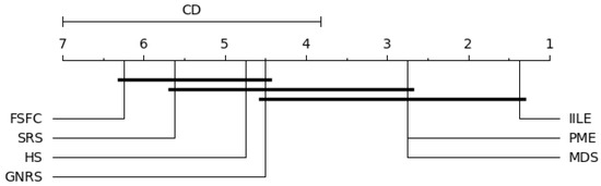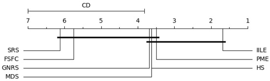 Figure 6 shows significant differences between IILE and HS, FSFC, SRS, GNRS under KNN, PME performs consistently with MDS, and both of them are superior to FSFC and SRS. For SVM (as shown in Figure 7), a significant difference exists between IILE and SRS, FSFC, GNRS, PME has a slight difference with MDS. Figure 8 shows significant differences between IILE and FSFC, SRS, and GNRS under CART. It is worth noting that under the CART classification model, the difference between PME and MDS has expanded, although this is not significant (the difference is less than the CD value). The average results in Figure 9 show significant differences between IILE, FSFC, GNRS, and SRS. The above results statistically indicate that IILE is superior to the other methods.