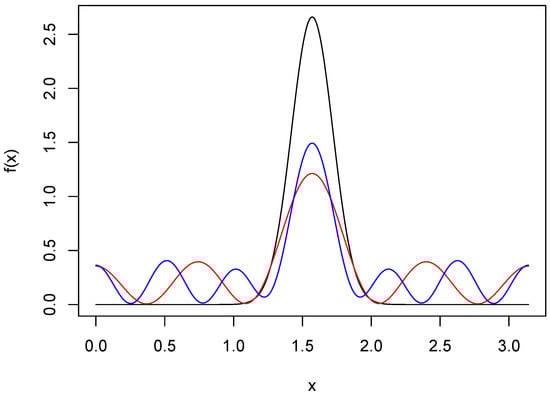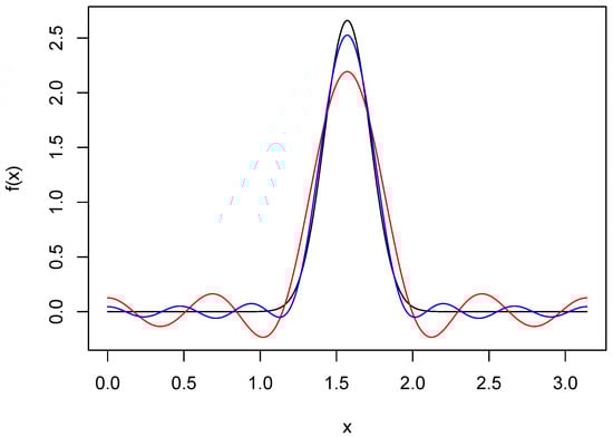 A plot of this density when and is seen in Figure 1. Also seen there are Fourier series approximations and . The latter of these does a good job of resolving the peak, but both and have spurious modes in the tails. These features are due, of course, to the fact that the cosine series may be expressed as a convolution of f and the Dirichlet kernel, which has oscillating tails.