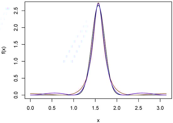 Fourier series approximations of wrapped normal density. The black curve is the wrapped normal density f with and . The red and blue curves are Fourier series approximations of f based on truncation points 8 and 12, respectively.
