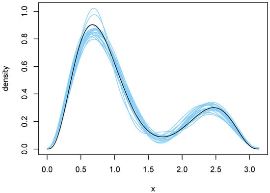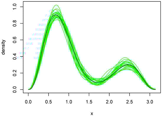 the subject of our simulation is , , which is the black curve in Figure 4 and Figure 5. Twenty independent random samples of each were drawn from f.
