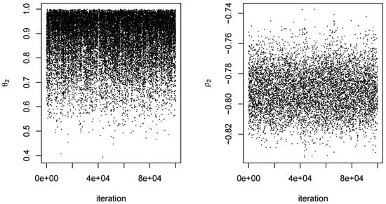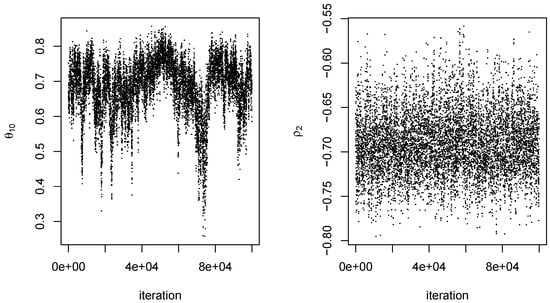 For each dataset, an MCMC procedure as described in Section 4 was conducted for . The value of the scale parameter s was 0.10 for all proposal distributions. For each q, an initial set of 10,000 iterations was conducted using starting values of 0 for all components of . Because of the arbitrariness of the starting values, there was a fairly long burn-in period for at least some values of q. We therefore obtained parameter estimates from the initial 10,000 iterations and used them as starting values in a second set of 100,000 iterations, which was the output ultimately used to obtain our results. Mixing of and tended to be somewhat better than that of the components of . In addition, not surprisingly, mixing of the output was better at smaller q than at larger ones. In any event, 100,000 iterations appeared to be more than adequate, even when . Typical examples of the output obtained are given in Figure 6 and Figure 7.