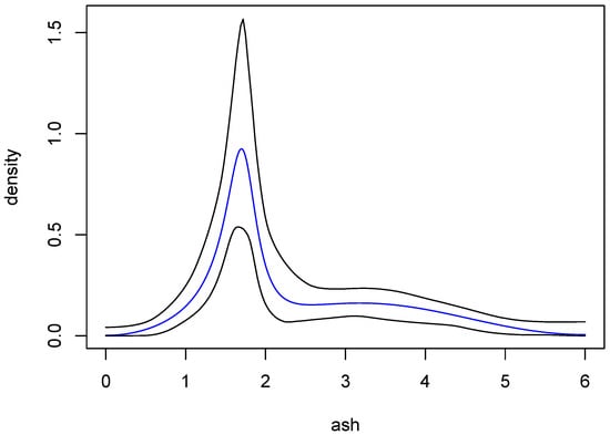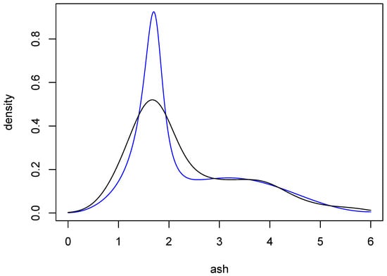 Data on wine attributes are available from the UC Irvine Machine Learning Repository. The data “are the results of a chemical analysis of wines grown in the same region in Italy but derived from three different cultivars”, and have been analyzed in [14]. Here, we consider the attribute ash, which consists of 177 observations. The black curve in Figure 8 is a Gaussian-kernel density estimate for these data, with bandwidth chosen by the normal reference method [5] (p. 45).