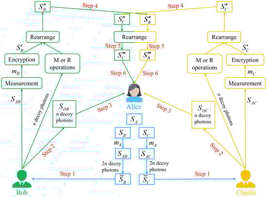 - RR: Do nothing; Once all decoy photons have been processed, Bob (Charlie) reorders all the particles in the sequence () to obtain a new sequence (). Bob and Charlie then send and to Alice, respectively.