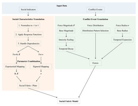Social indicators are systematically translated into material properties through a three-step process: normalization, response function application, and parameter combination. This translation framework represents a key methodological contribution, enabling diverse socioeconomic data to be encoded into physical parameters.