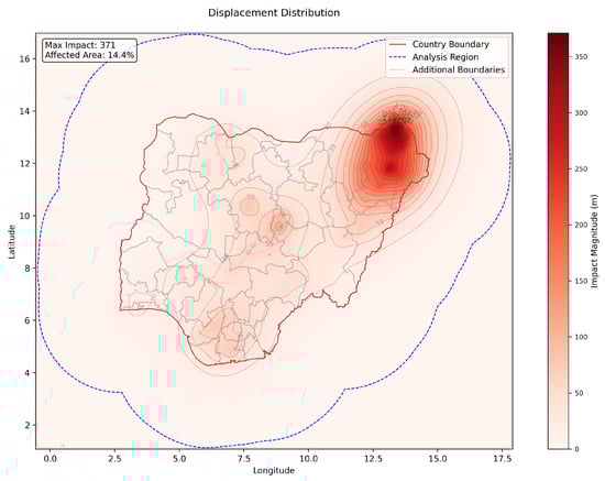 The framework generates finite element meshes with 10 km resolution, assigns spatially varying material properties from social indicator mappings using Equations (3)–(12), applies force representation of conflict events using Equations (13)–(16), and solves Equation (1) for displacement fields representing cumulative impact. The implementation is built entirely on widely adopted Python libraries (NumPy 2.1.3 [41], SciPy 1.14.1 [42], Matplotlib 3.9.2 [43], GeoPandas 1.0.1 [44], Rasterio 1.4.2, Pandas 2.2.3 [45], Plotly 6.2.0 [46], Contextily 1.6.2) without requiring additional GIS or specialized software, ensuring maximum accessibility and reproducibility. Its reliability is verified through comprehensive testing including element mathematics, eigenvalue analysis, mesh connectivity, and boundary condition validation available in the open-source code [33], with systematic behavioral analysis detailed in the extended pre-print thesis [34]. Validation testing confirmed expected physical behaviors: thickness effects follow cubic scaling (as shown in Equation (2)), Young’s modulus shows linear displacement relationships, and multiple forces demonstrate appropriate superposition behaviors consistent with the mathematical formulation.