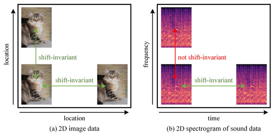 Two-dimensional convolution has been widely used in feature extraction of spectrograms of sound signals and has achieved certain success. However, 2D convolution has been proposed to recognize 2D image data and is therefore not fully compatible with audio data. Figure 1 illustrates the different shift-invariance of 2D image data and 2D audio data. Since shifting 2D image data in two dimensions does not result in a change of information, it only differs in position. Therefore, it remains unchanged in both dimensions, and convolution operations in any dimension are physically continuous. But the spectrogram of an audio signal sounds different when it is shifted along the frequency axis. This means that the spectrogram of the audio is shift-invariant only along the time axis and not along the frequency axis. To solve this problem, Nam et al. [27] proposed Frequency Dynamic Convolution (FDC), which applies kernels that adapt to the input frequency components. However, extracting attention using convolution instead of fully connection leads to a loss of global associations. Inspired by this, we propose an improved FDC by combining these two structures. In addition, the single scale of FDC makes the receptive field limited, resulting in insufficiently rich local features. Based on the above factors, this paper proposes two modules: an (a) FMSA module and a (b) TMSA module. These two modules apply improved dynamic convolution for feature extraction at multiple scales in the frequency and time dimensions, respectively. This makes the features contain more information to avoid the limitations of the convolutional feature and ensure physical consistency.