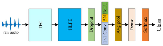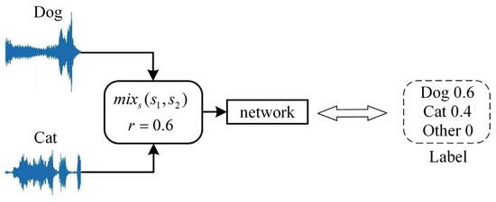 The raw audio was down-sampled to 20 kHz, and the portion between the first non-zero point to the last non-zero point was retained. To make the training more effective, we use BC learning [30] to mix the dataset, which can enlarge Fisher’s criterion in the feature space and make the positional relationship of feature divisions more obvious. We randomly select two clips from two different classes and then mix them as input to the network to train the corresponding mixing ratio. The size of the clip is set to 30,225 (about 1.51 s audio). The mixing formula is as follows: