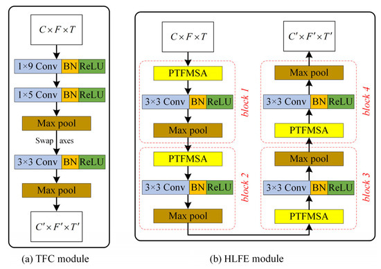 After obtaining the 2D features, further time-frequency high-level features need to be extracted. As shown in Figure 3b, the HLFE module mainly consists of 4 blocks. Each block is composed of a PTFMSA layer and a 2D convolutional layer with a kernel size of 3, followed by a maxpool layer. All convolution layers are followed by a BN and a ReLU layer by default. The PTFMSA module extracts multi-scale time-frequency features, and then the level of features is improved by the 2D convolutional layer. Finally, the features are compressed by the maxpool layer. The HLFE module is formed by stacking 4 blocks, which are used to extract high-level features.
