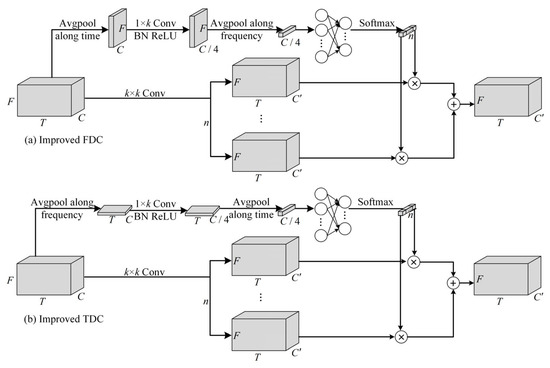 As shown in Figure 4, improved FDC and improved temporal dynamic convolution (TDC) are implementations of improved dynamic convolution in the frequency and time domains, respectively. Take improved FDC, for example; it contains two branches, one is the attention branch and the other is the convolutional branch. In the attention branch, input feature map is first compressed along the time dimension by avgpool. The 1 × k convolution followed by a BN and a ReLU layer is applied to extract frequency local correlation features to ensure shift-invariance of the 2D convolution along the frequency dimension. The reduction from C channels to is achieved through an additional 1 × 1 point wise convolution after the 1 × k operation, which serves as a channel projection for efficiency.